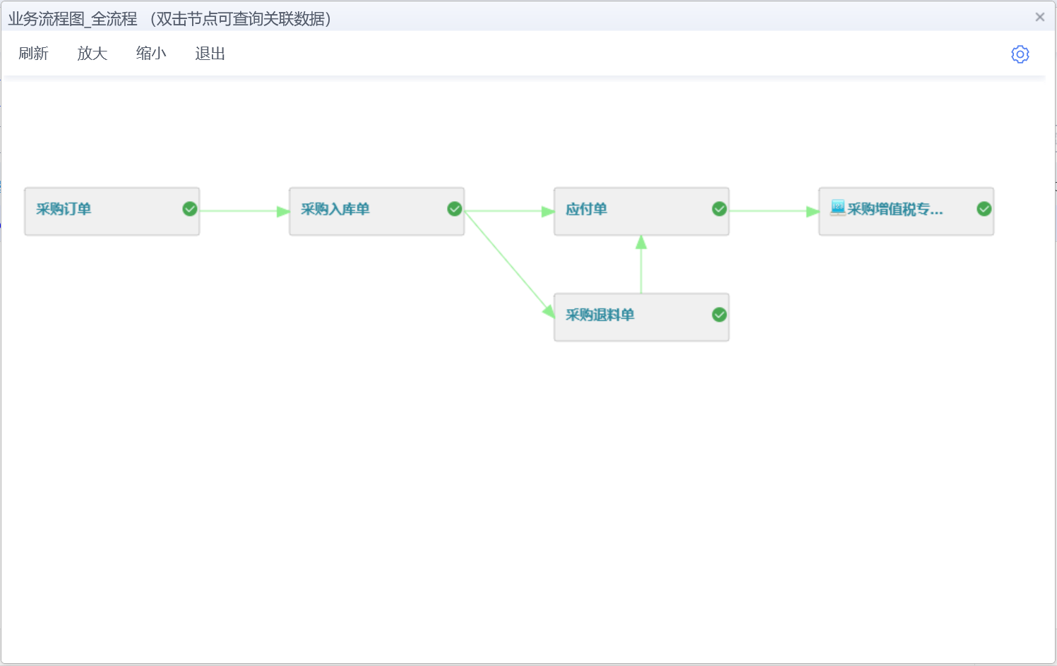 以上步骤完成退料。退料后系统会生成负数的《应付单》,收到供应商退款后,从负数《应付单》下推《付款退款单》,完成采购退款操作。