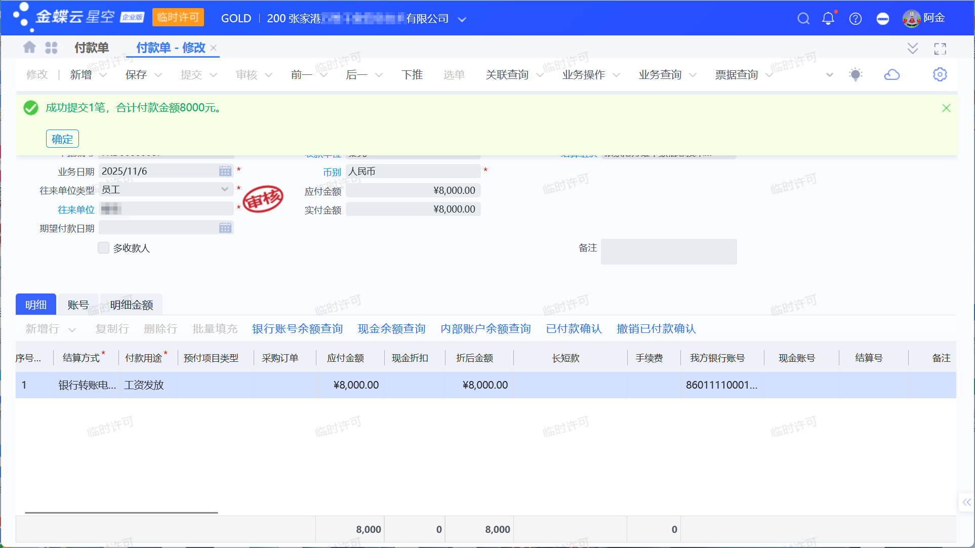 金蝶系统中提交付款
