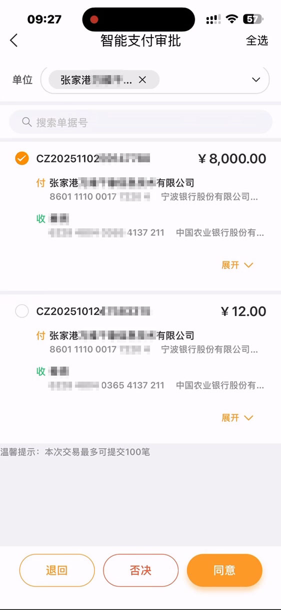 点击待办事项后,选中需要审批单据同意或者拒绝,完成审批。