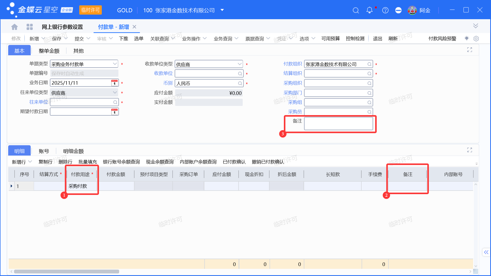 1. 付款明细付款用途:付款单明细行的付款用途字段,如下图付款单中序号1标注位置。(默认设置)