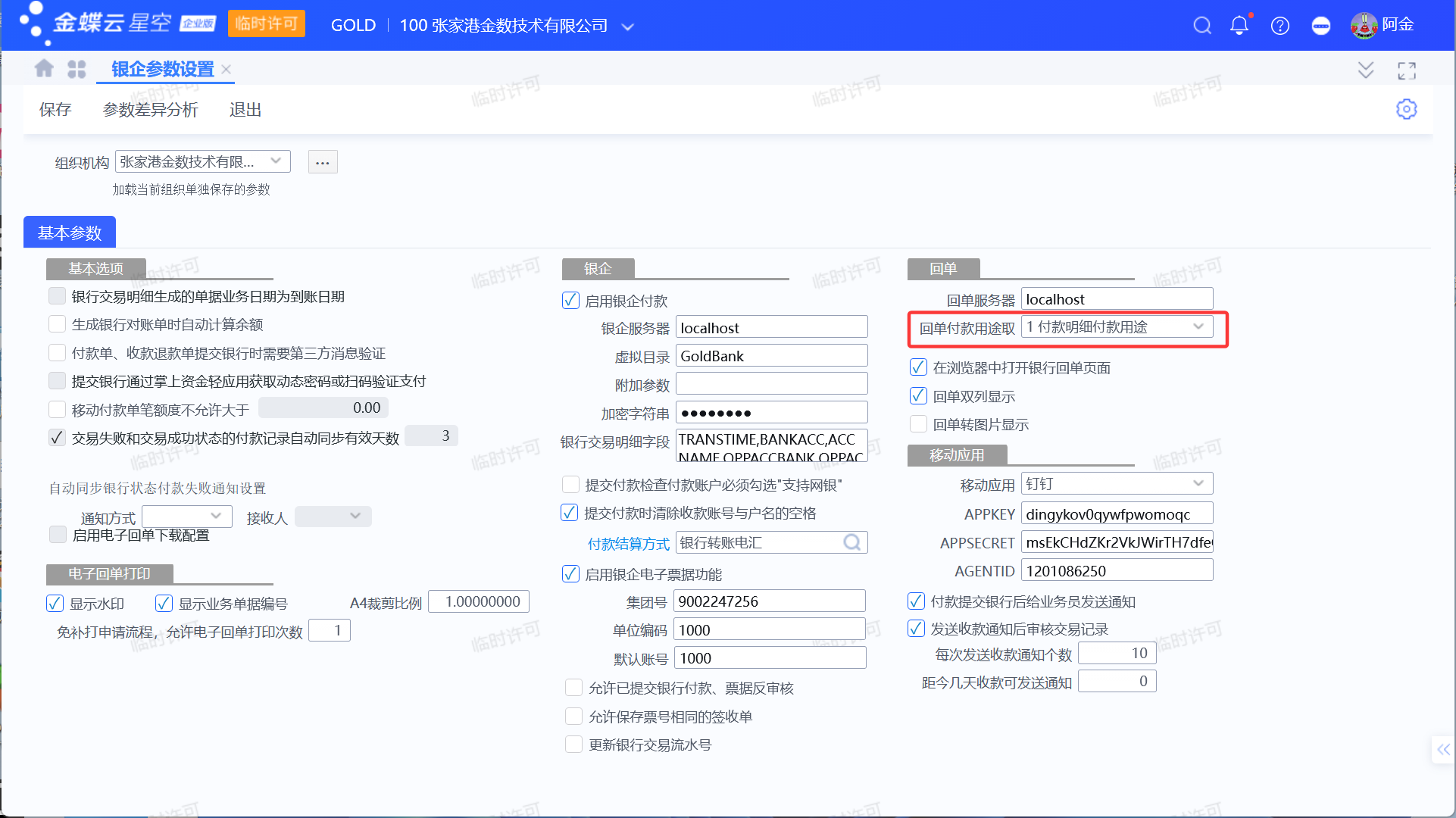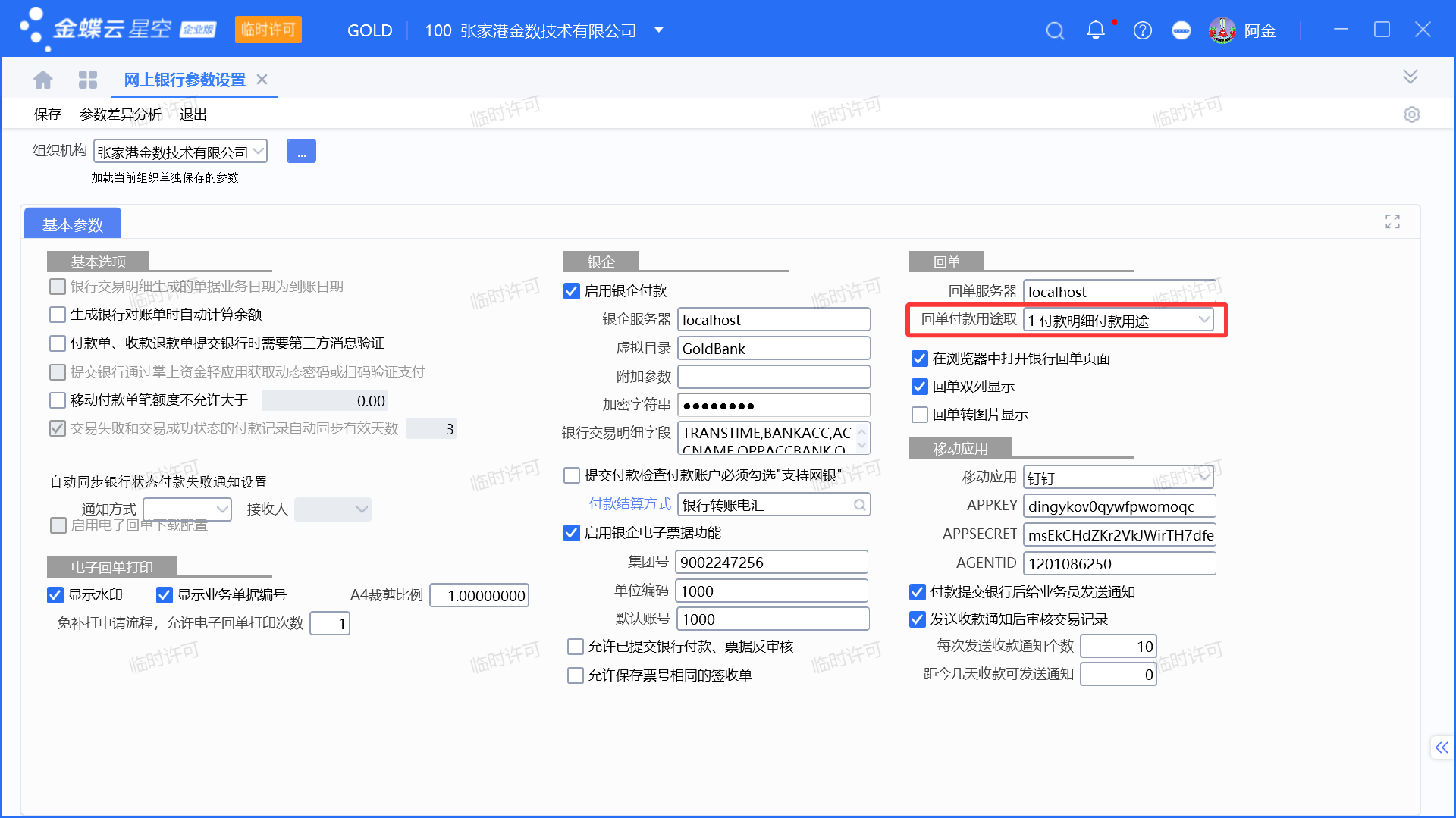 金蝶银企的回单付款用途备注取自字段,由【网上银行参数】中的设置决定。