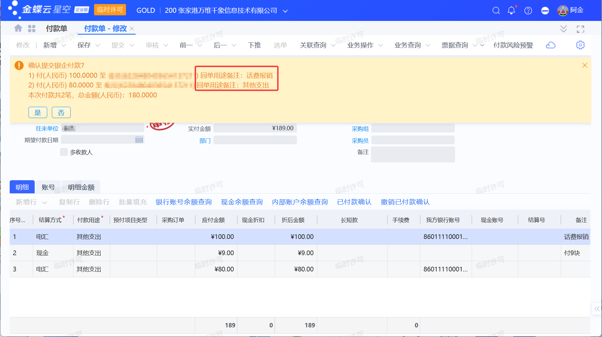 设置后,付款提交银行时会根据设置显示回单备注内容,再次提醒用户。