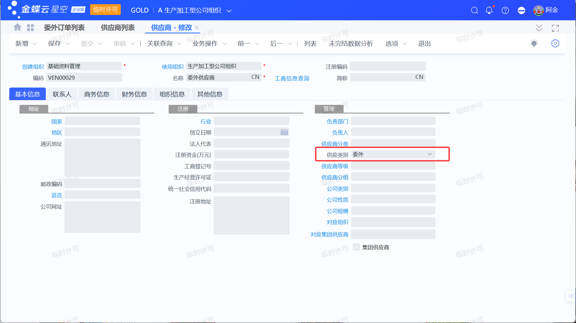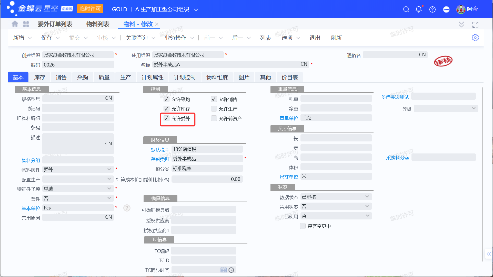 需要进行委外业务的物料需要勾选“允许委外”。