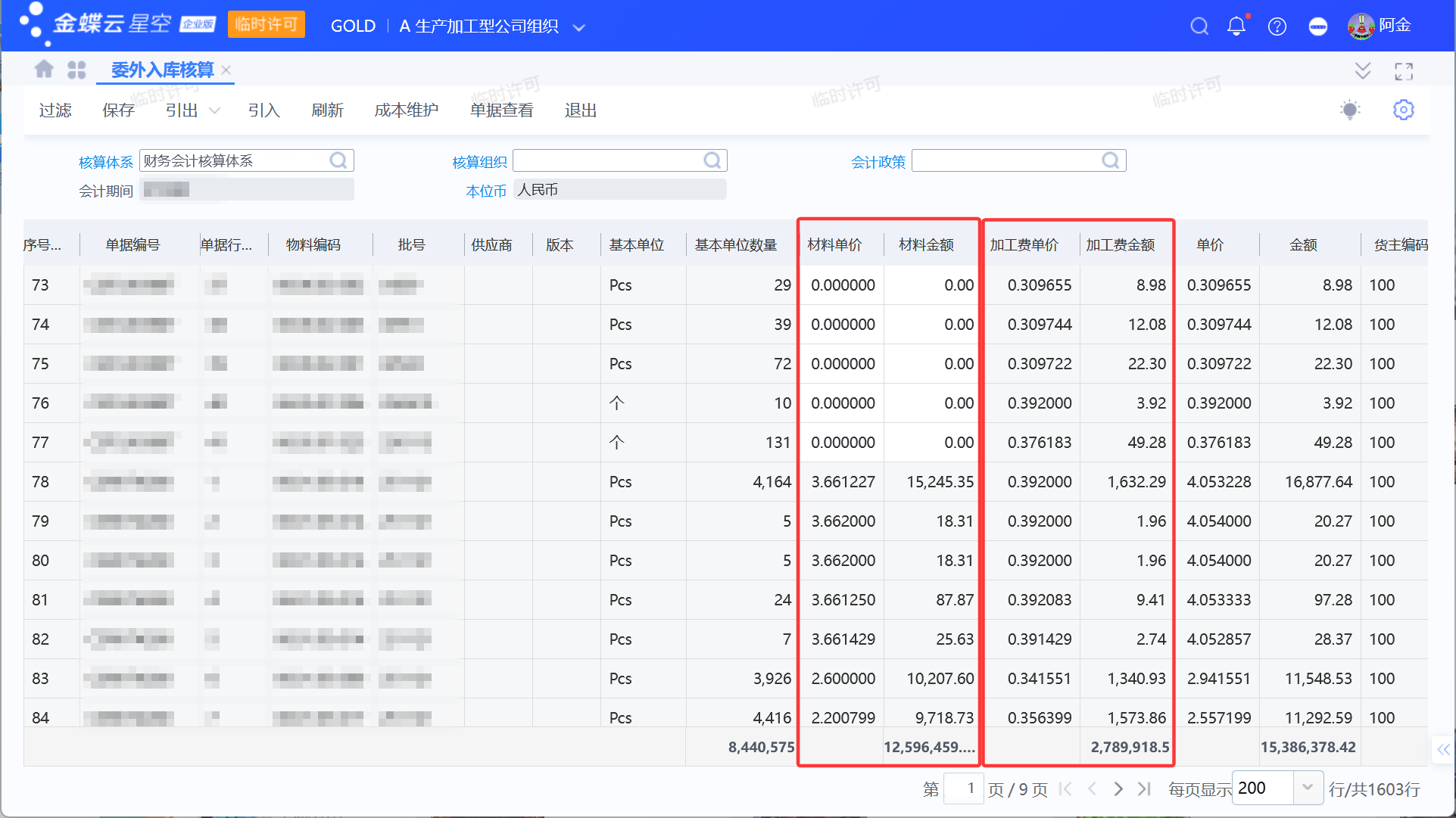进行成本核算后,可以在委外入库核算看到委外订单的加工费以及材料费。