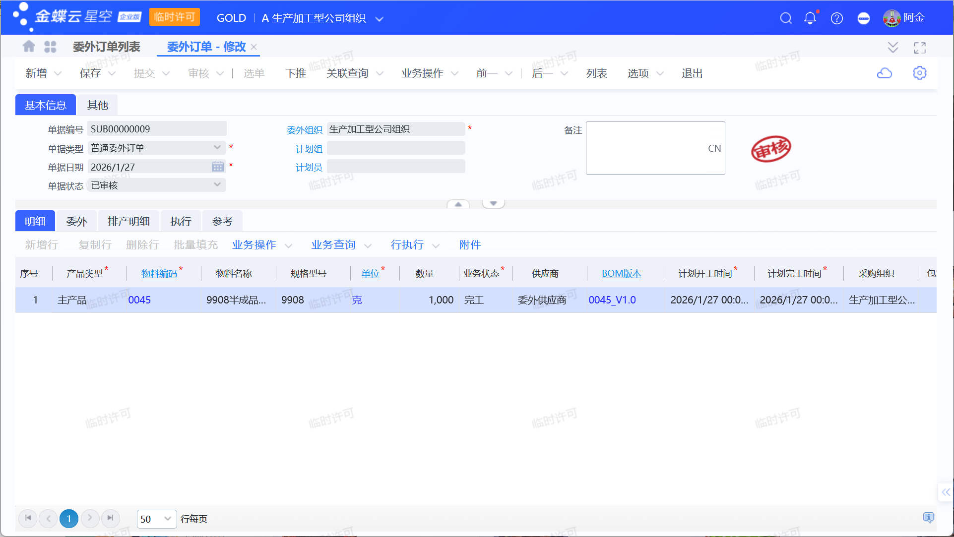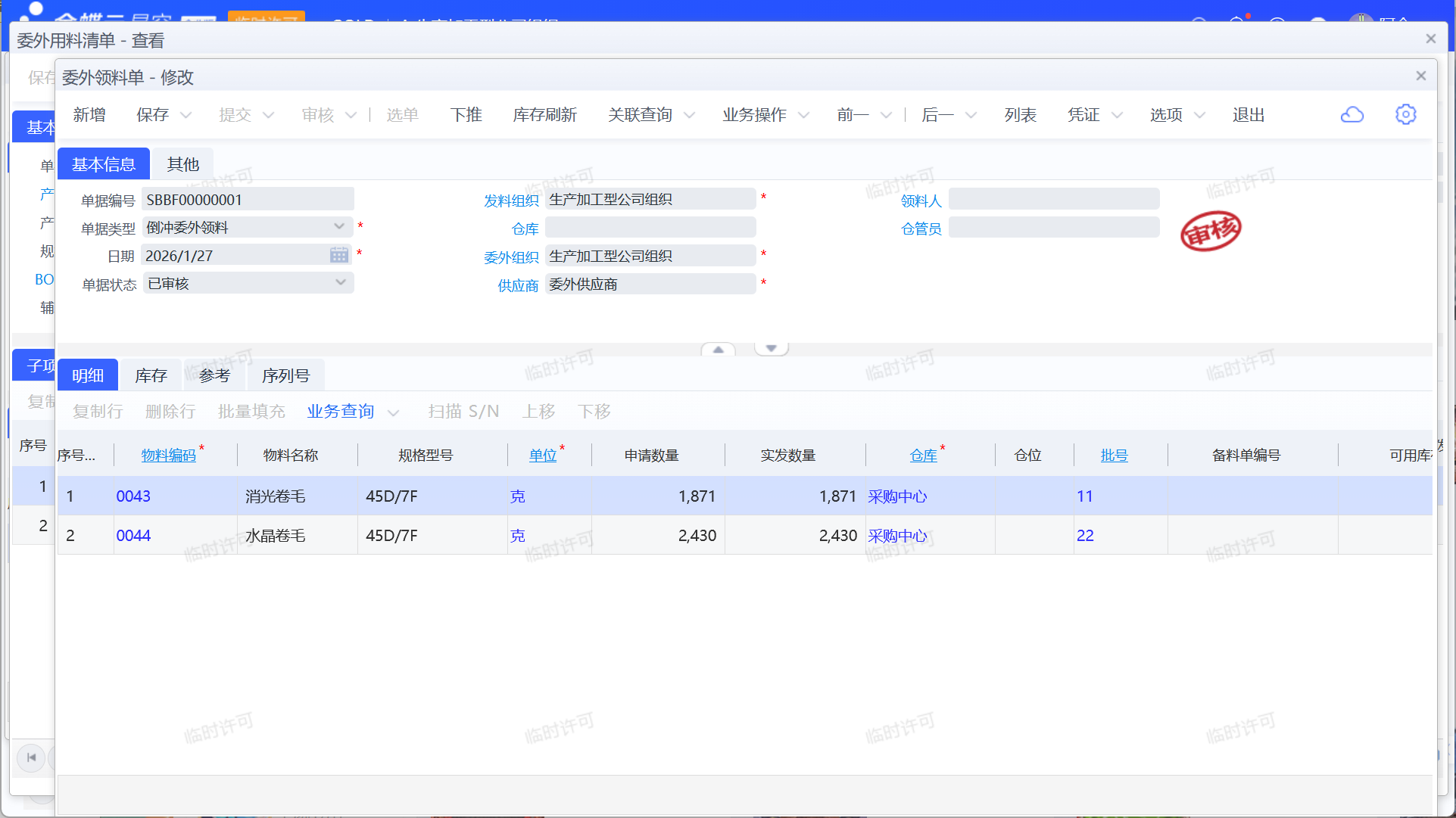 委外订单审核后自动生成委外用料清单,委外用料清单下推委外领料单,完成物料领用。