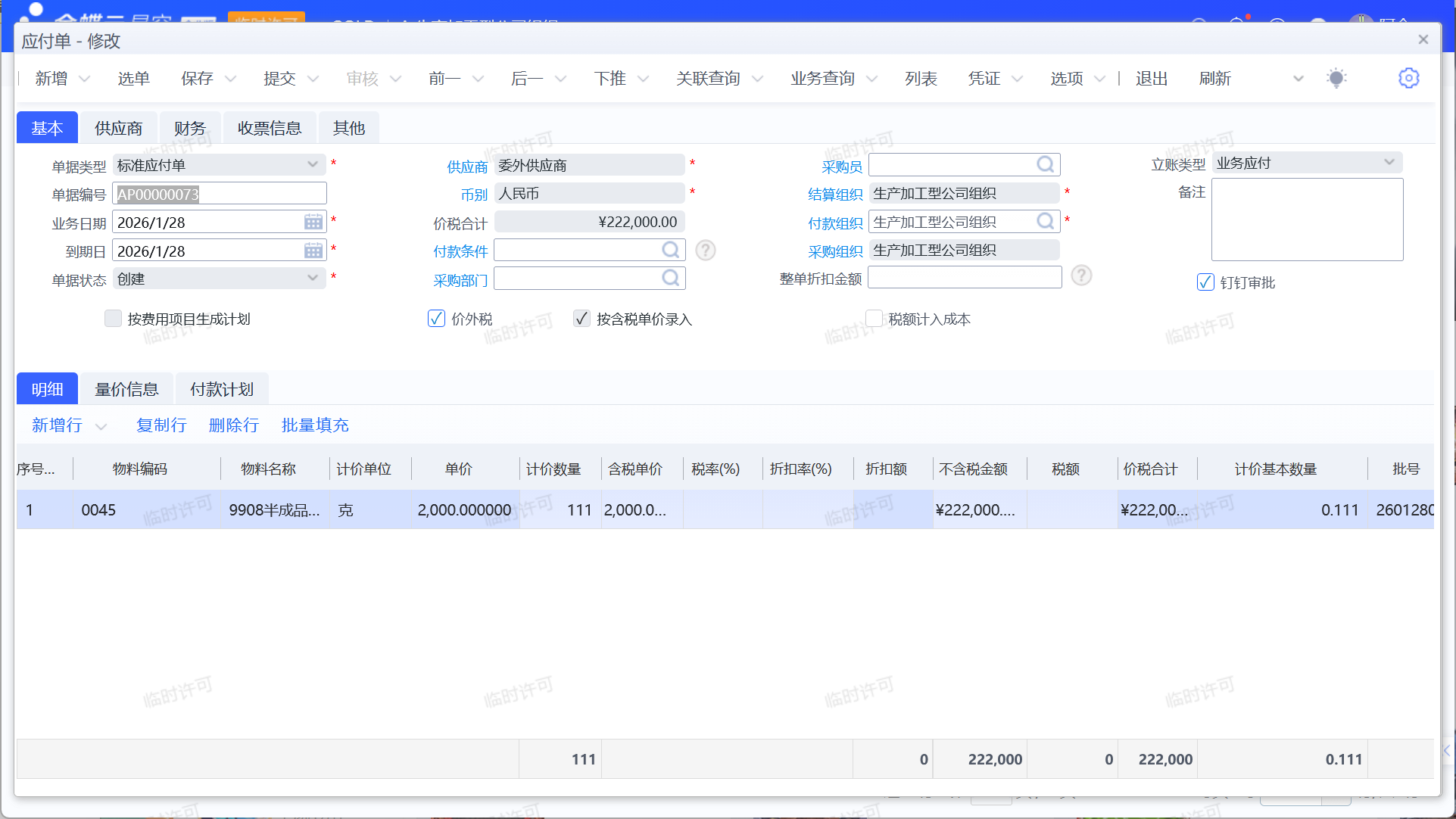 委外产品入库后,需要向供应商支付元加工费,通过采购入库单下推应付单