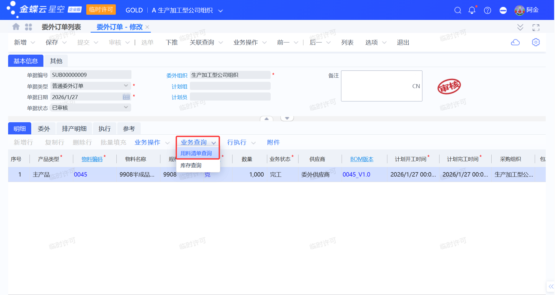 委外订单审核后,在“业务查询”—“用料清单查询”—提交审核对应的用料清单,可以看到需要领用消耗的原材料。